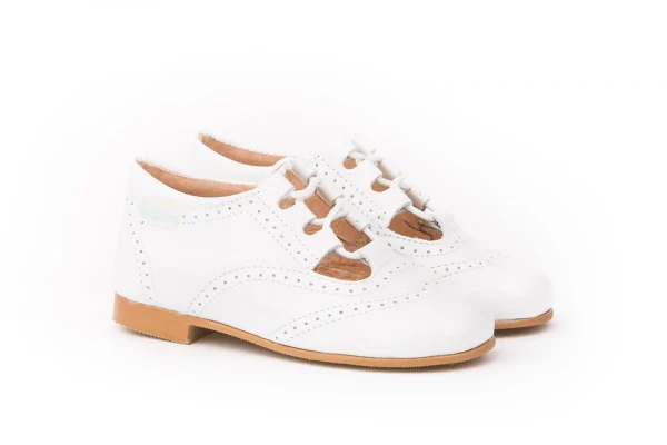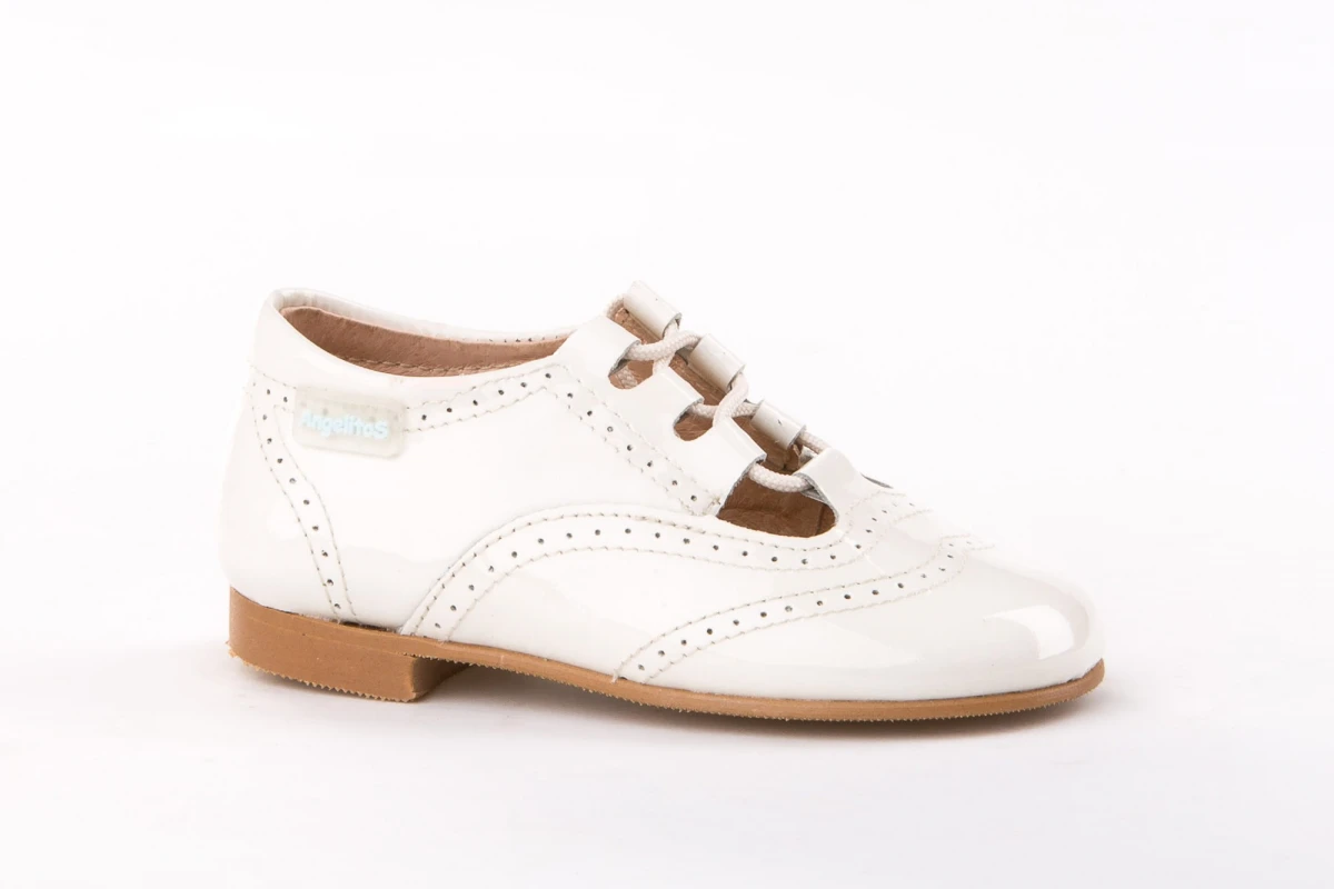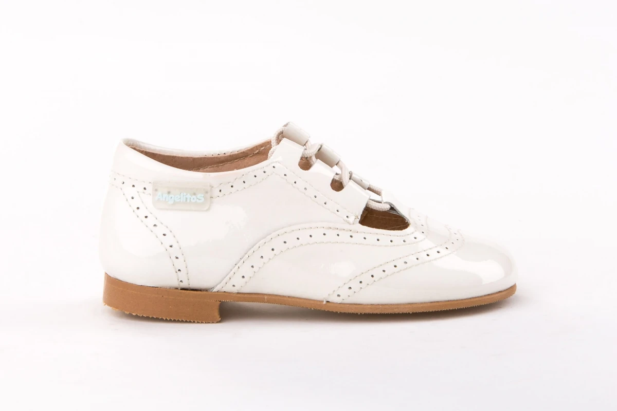 Unas inglesitas sofisticadas, suaves y blanditas. Ideales para los pies de los más pequeños. Zapato tipo inglesita fabricado en charol de piel bovina con sistema de cierre de cordones. La parte interior está fabricada con forro de piel natural, protector de punteras y talones, planta con puente anatómico y suela de goma antideslizante. Calzado diseñado y fabricado en España.