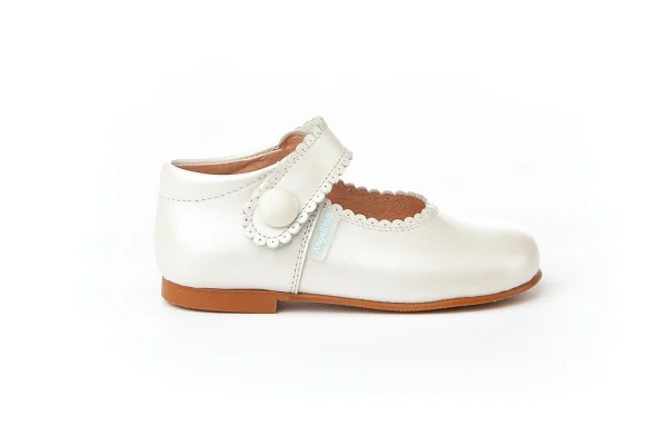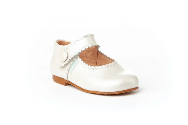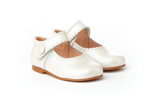 Unas merceditas sofisticadas, suaves y blanditas. Ideales para los pies de los más pequeños. Zapato tipo mercedita fabricado en napa nacarada de piel bovina con sistema de cierre de velcro. La parte interior está fabricada con forro de piel natural, protector de punteras y talones, planta con puente anatómico y suela de cuerolite antideslizante.