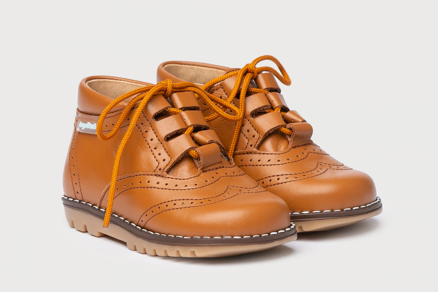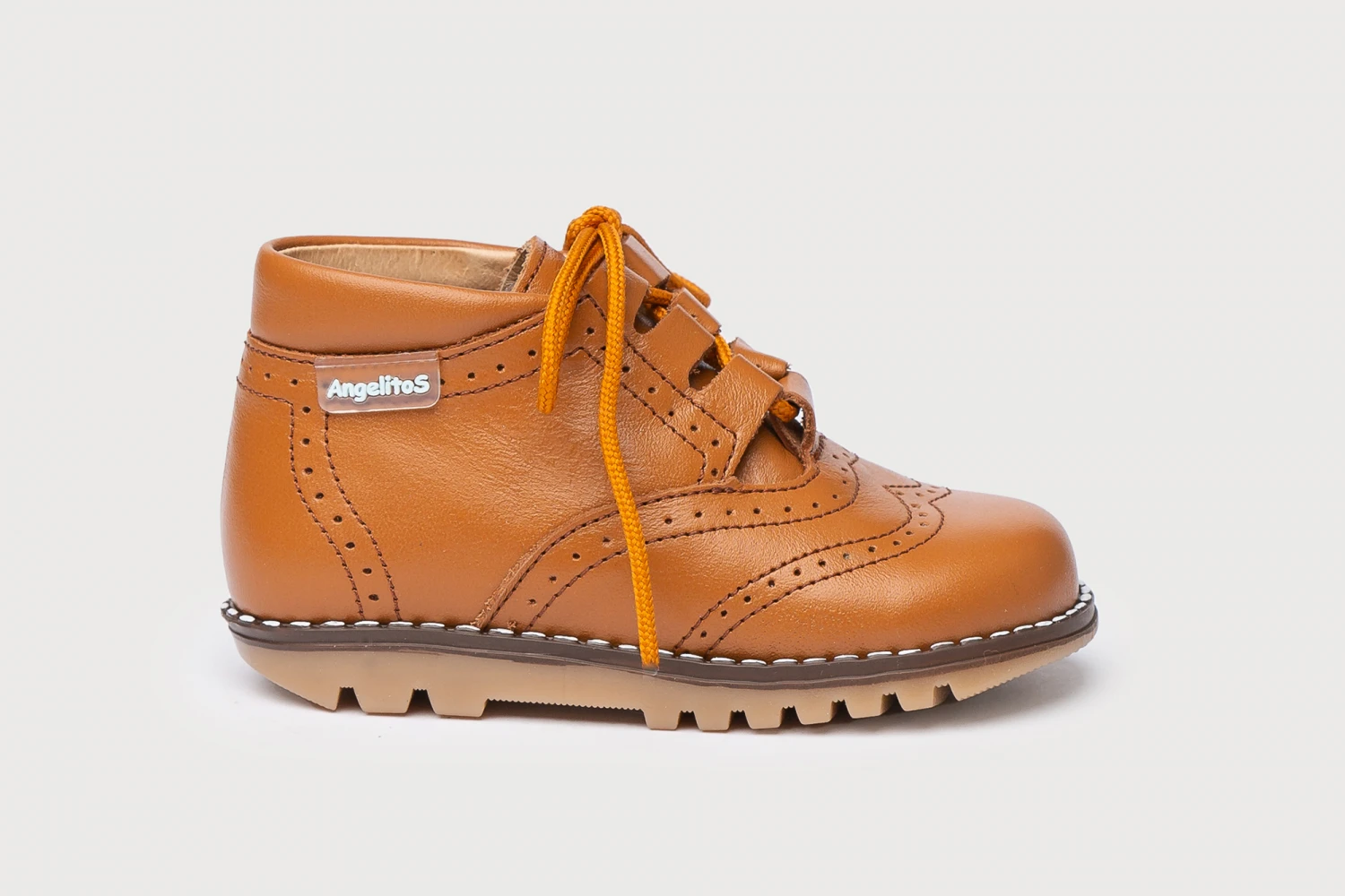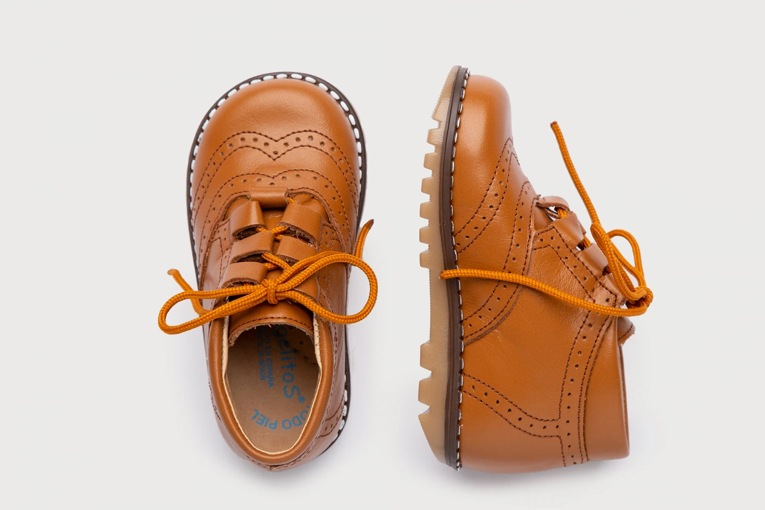 Una línea clásica. Cómodos y blanditos, perfectos para los pies de los más pequeños. Zapato tipo botita inglesita con el talón más alto con fabricado en napa de piel bovina con sistema de cierre de cordón. La parte interior está fabricada con forro de piel natural, protector de punteras y talones, planta con puente anatómico y suela de goma antideslizante. Calzado diseñado y fabricado en España ideal para preandantes y niños que ya han empezado a dar sus primeros pasos.