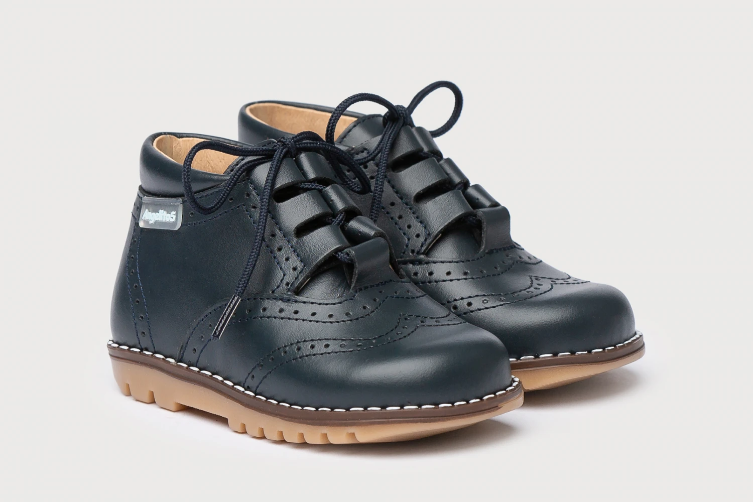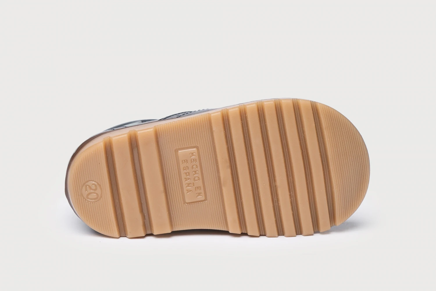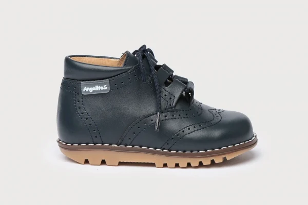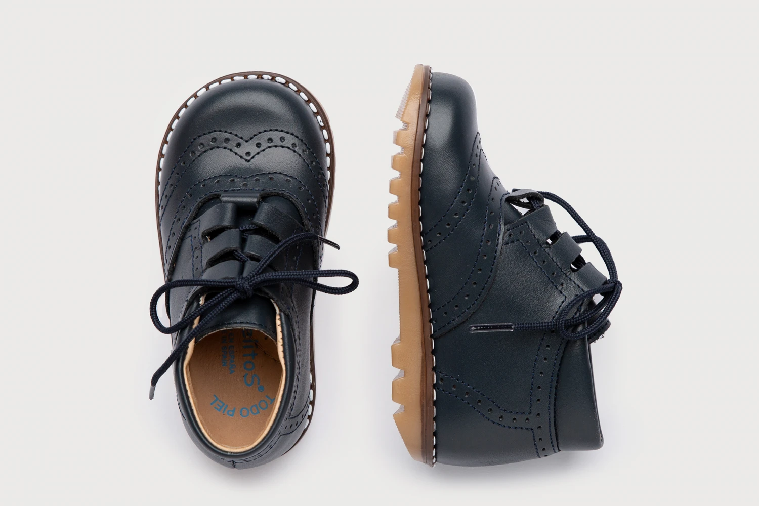 Una línea clásica. Cómodos y blanditos, perfectos para los pies de los más pequeños. Zapato tipo botita inglesita con el talón más alto con fabricado en napa de piel bovina con sistema de cierre de cordón. La parte interior está fabricada con forro de piel natural, protector de punteras y talones, planta con puente anatómico y suela de goma antideslizante. Calzado diseñado y fabricado en España ideal para preandantes y niños que ya han empezado a dar sus primeros pasos.
