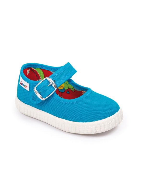 • Zapato tipo mercedita fabricado en tejido con sistema de cierre de botón en hebilla.