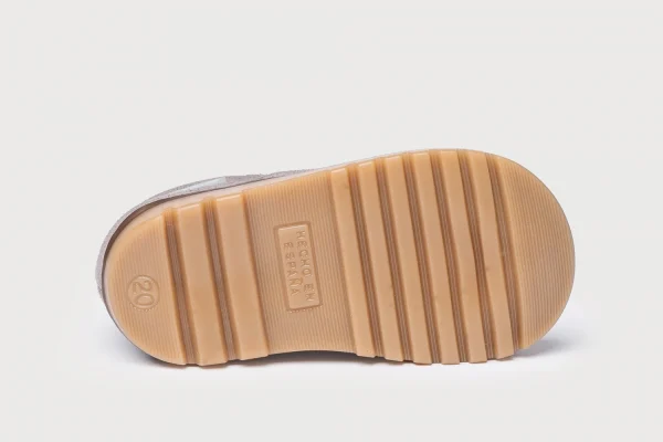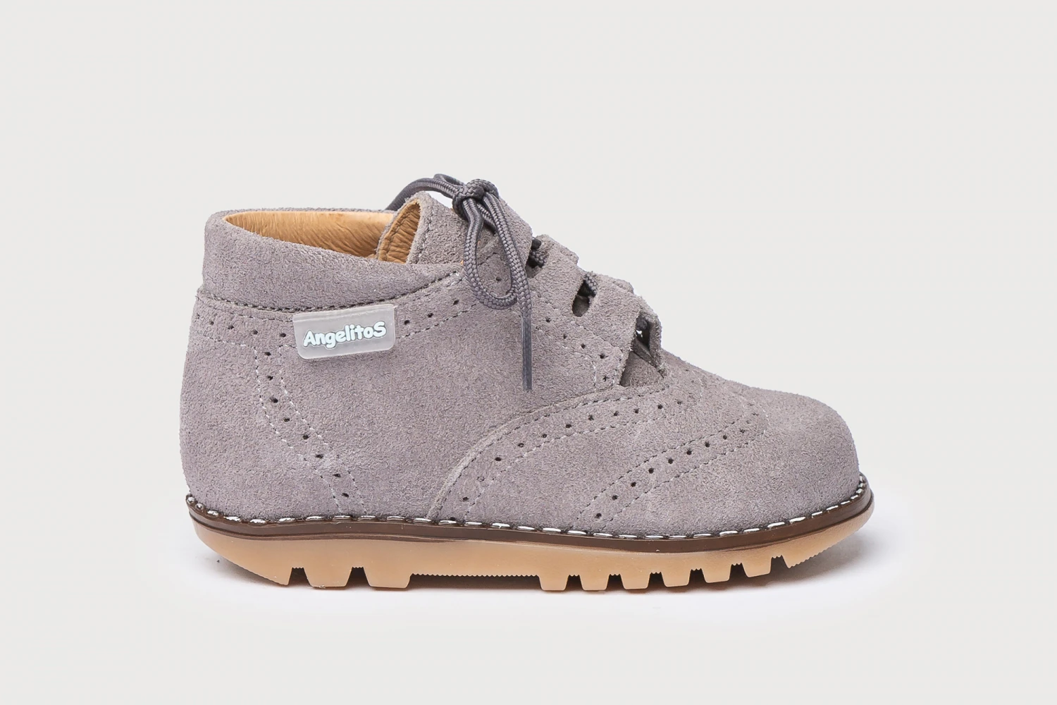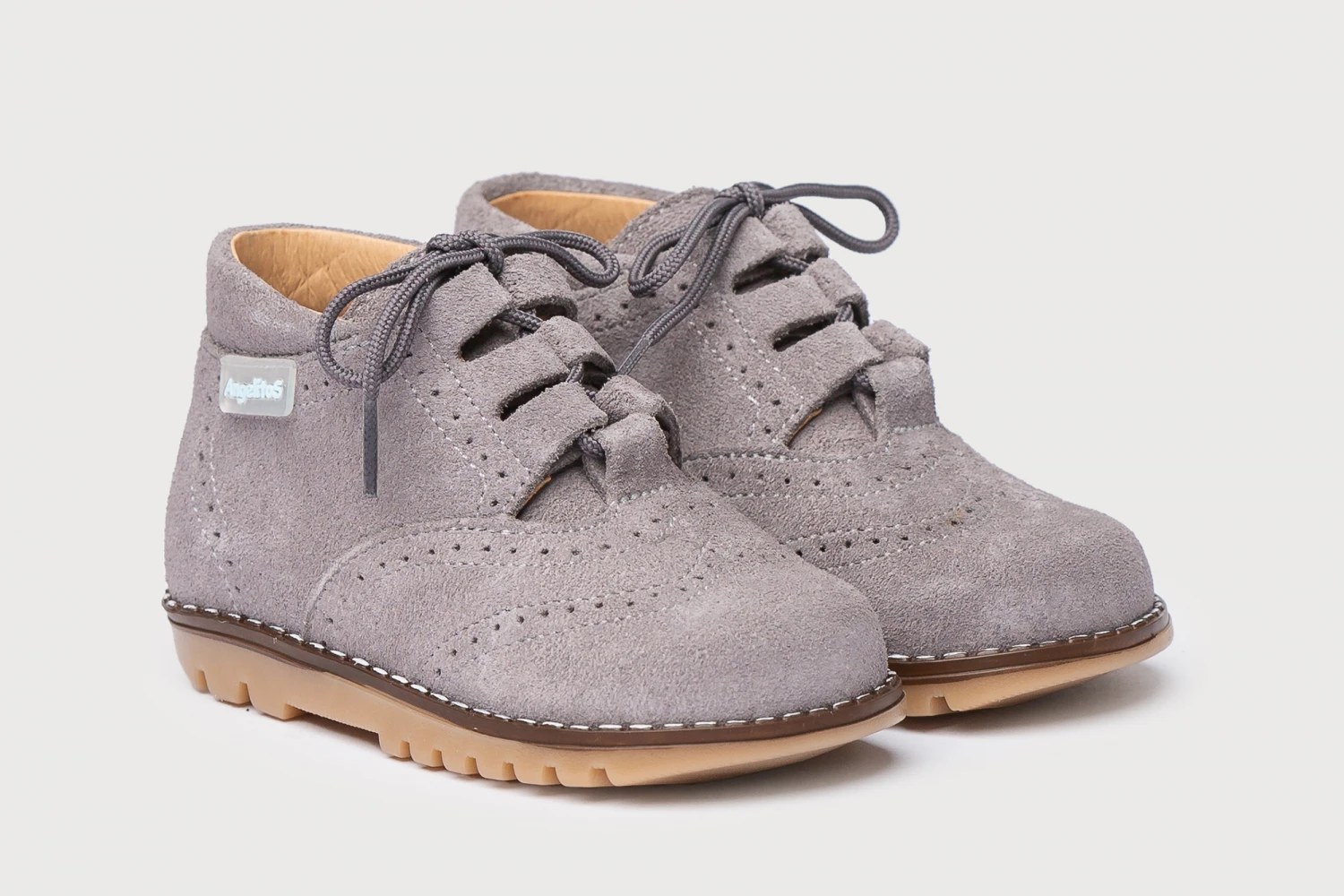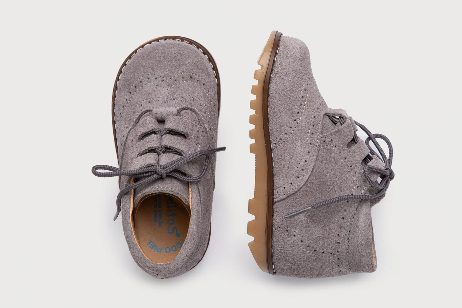 Una línea clásica. Cómodos y blanditos, perfectos para los pies de los más pequeños. Zapato tipo botita inglesita con el talón más alto con fabricado en ante afelpado de piel bovina con sistema de cierre de cordón. La parte interior está fabricada con forro de piel natural, protector de punteras y talones, planta con puente anatómico y suela de goma antideslizante. Calzado diseñado y fabricado en España ideal para preandantes y niños que ya han empezado a dar sus primeros pasos.