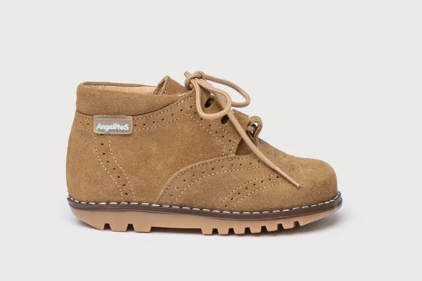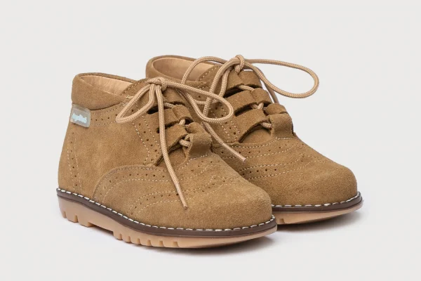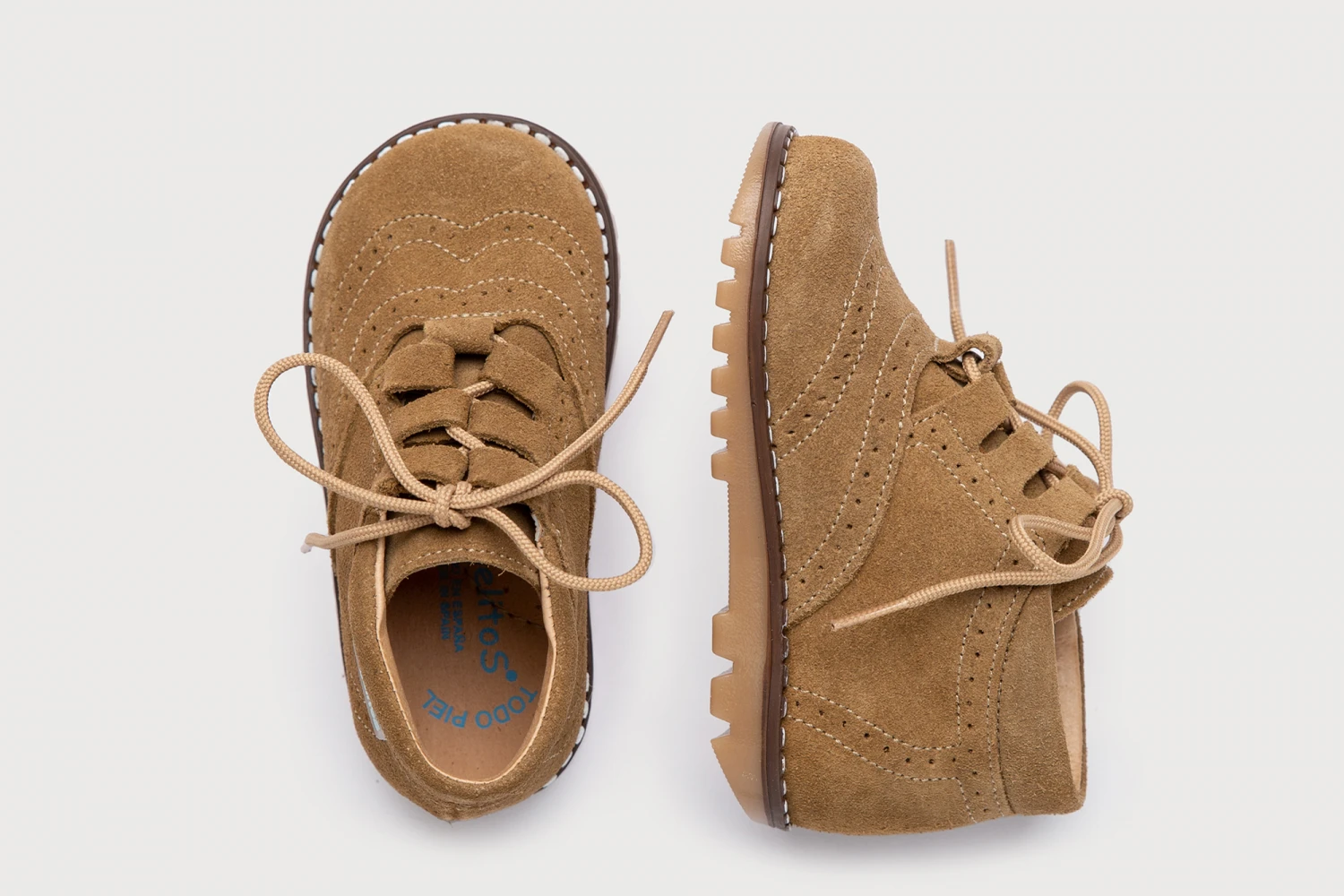 Una línea clásica. Cómodos y blanditos, perfectos para los pies de los más pequeños. Zapato tipo botita inglesita con el talón más alto con fabricado en ante afelpado de piel bovina con sistema de cierre de cordón. La parte interior está fabricada con forro de piel natural, protector de punteras y talones, planta con puente anatómico y suela de goma antideslizante. Calzado diseñado y fabricado en España ideal para preandantes y niños que ya han empezado a dar sus primeros pasos.