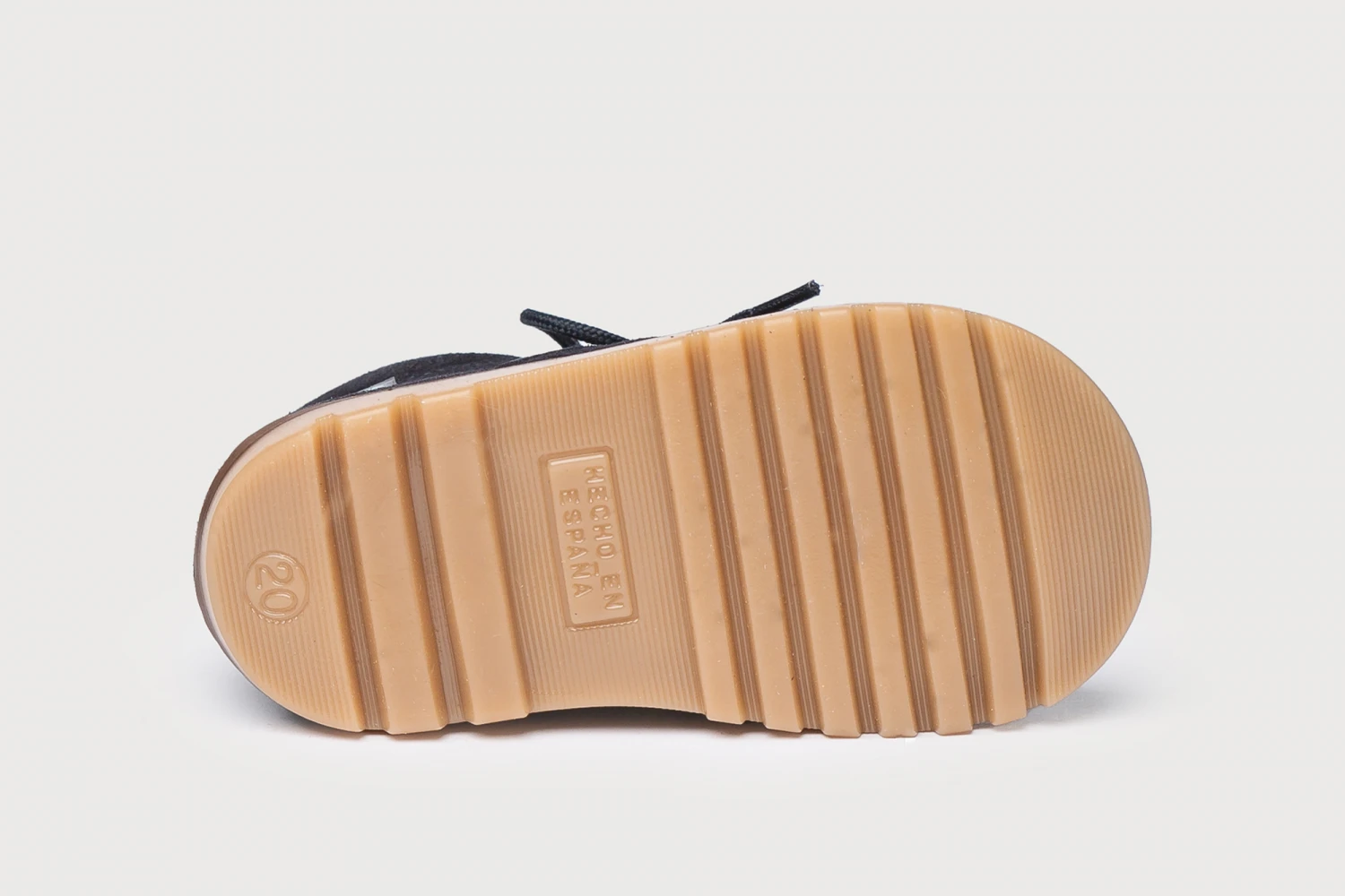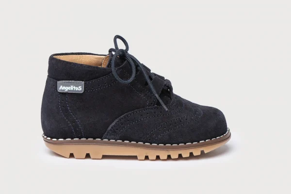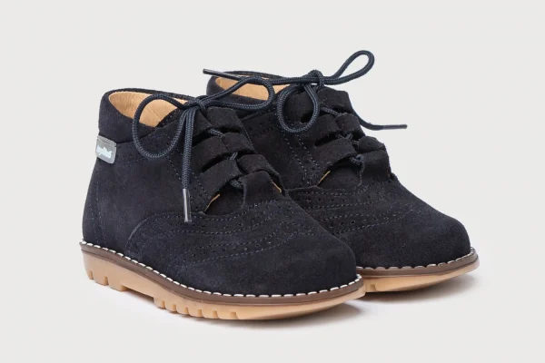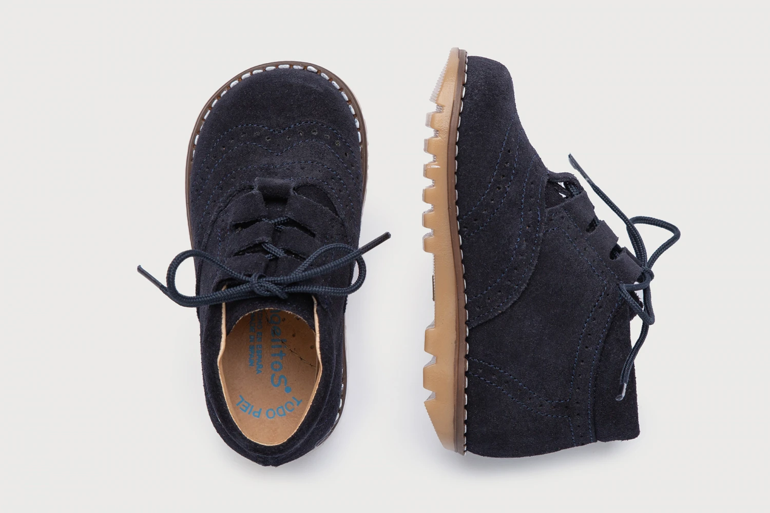 Una línea clásica. Cómodos y blanditos, perfectos para los pies de los más pequeños. Zapato tipo botita inglesita con el talón más alto con fabricado en ante afelpado de piel bovina con sistema de cierre de cordón. La parte interior está fabricada con forro de piel natural, protector de punteras y talones, planta con puente anatómico y suela de goma antideslizante. Calzado diseñado y fabricado en España ideal para preandantes y niños que ya han empezado a dar sus primeros pasos.