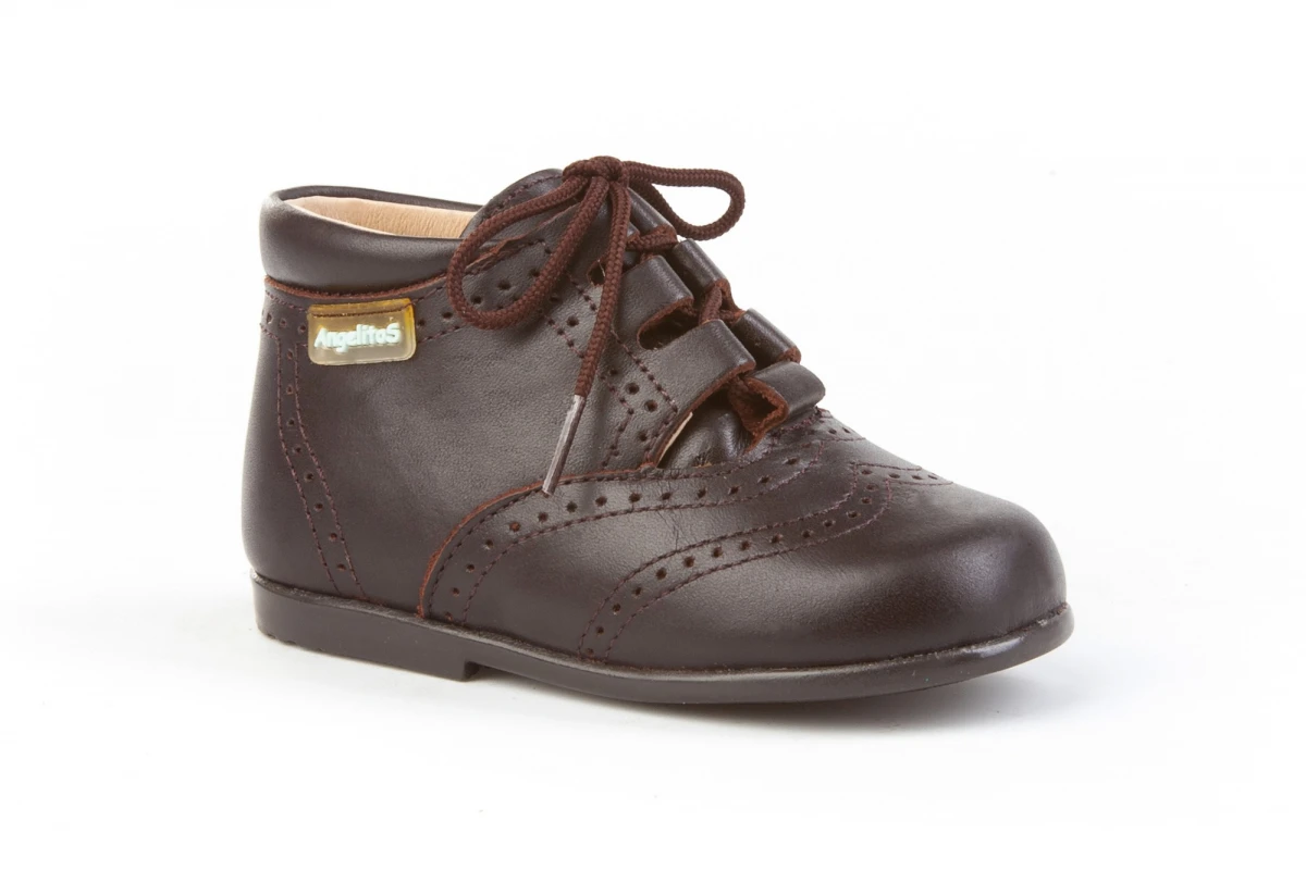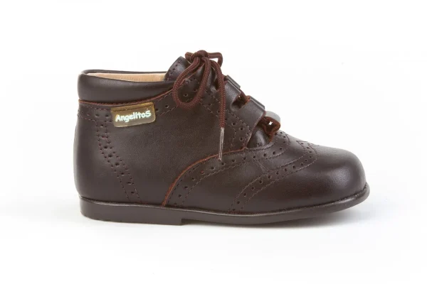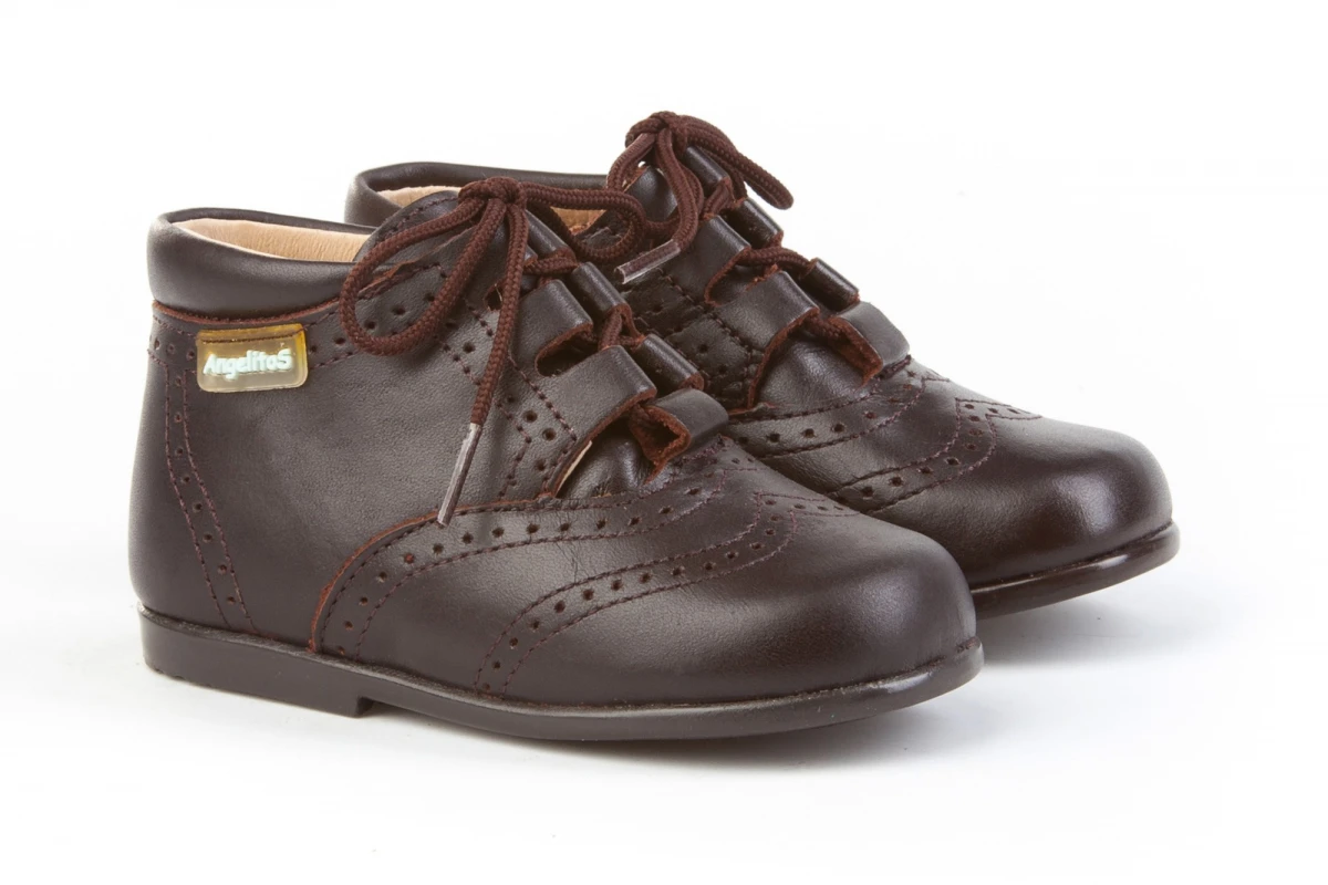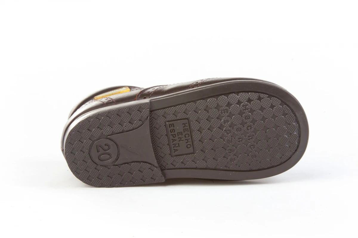 Una línea clásica. Cómodos y blanditos, perfectos para los pies de los más pequeños. Zapato tipo botita inglesita con el talón más alto con fabricado en napa de piel bovina con sistema de cierre de cordón. La parte interior está fabricada con forro de piel natural, protector de punteras y talones, planta con puente anatómico y suela de goma antideslizante. Calzado diseñado y fabricado en España ideal para preandantes y niños que ya han empezado a dar sus primeros pasos.