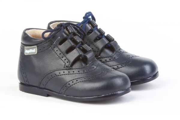 Una línea clásica. Cómodos y blanditos, perfectos para los pies de los más pequeños. Zapato tipo botita inglesita con el talón más alto con fabricado en napa de piel bovina con sistema de cierre de cordón. La parte interior está fabricada con forro de piel natural, protector de punteras y talones, planta con puente anatómico y suela de goma antideslizante. Calzado diseñado y fabricado en España ideal para preandantes y niños que ya han empezado a dar sus primeros pasos.