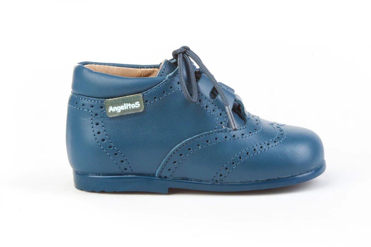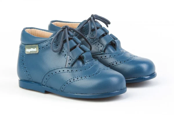 Una línea clásica. Cómodos y blanditos, perfectos para los pies de los más pequeños. Zapato tipo botita inglesita con el talón más alto con fabricado en napa de piel bovina con sistema de cierre de cordón. La parte interior está fabricada con forro de piel natural, protector de punteras y talones, planta con puente anatómico y suela de goma antideslizante. Calzado diseñado y fabricado en España ideal para preandantes y niños que ya han empezado a dar sus primeros pasos.