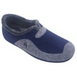Zapatilla Invierno cerrada básica realizada sobre un cálido y suave tejido de pelo en color marino y gris. La comodidad para cuando estas en casa con su plantilla acolchada de confort.