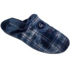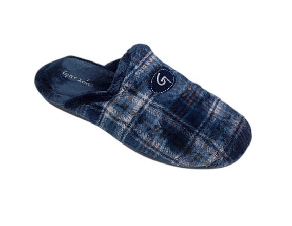 Zapatillas de estar por casa, fabricadas en suaves y calidos tejidos color marino en forma de cuadros.