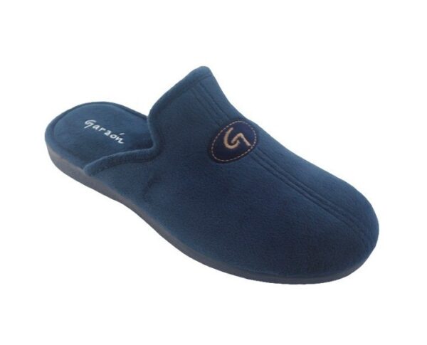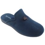 | Zapatilla chinela para casa básica realizada sobre un cálido y suave tejido en azul marino con el logo de garzon.