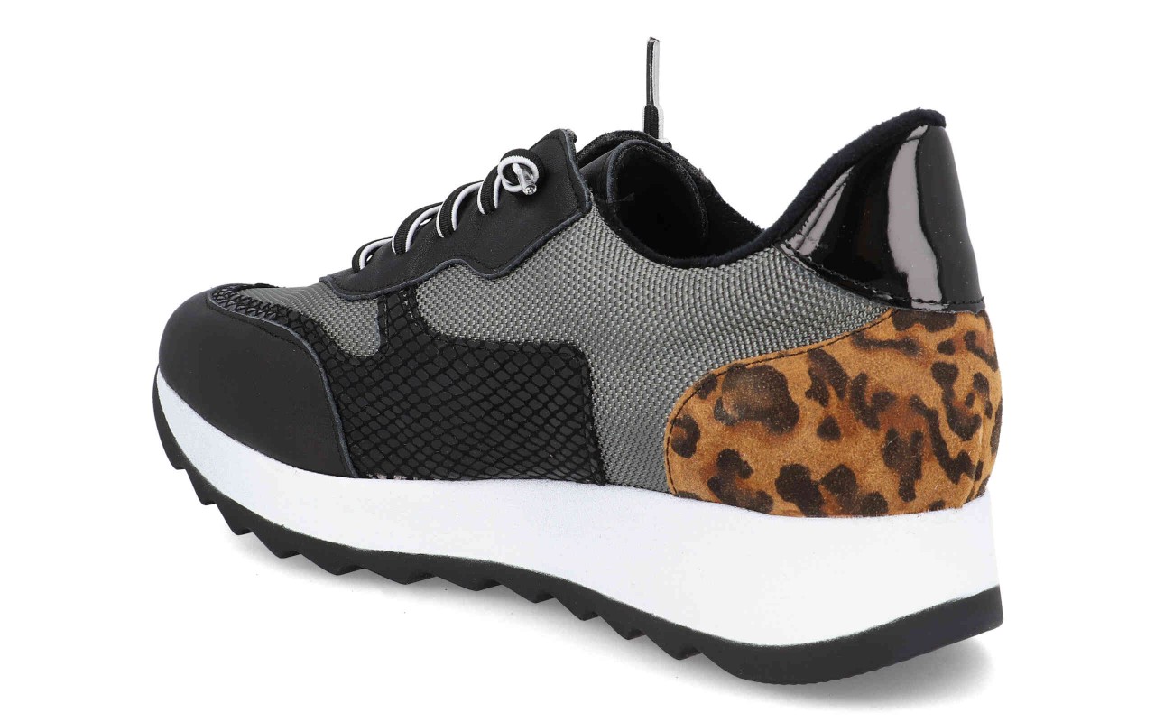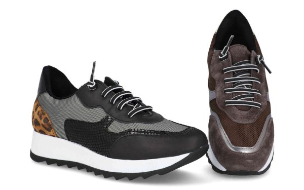 Zapatos mujer casual leopardo, unas zapatillas urbanas muy cómodas y con mucho glamour y estilo que esta temporada de otoño invierno 2023, están muy de moda, plantilla de pie acolchada, material corte exterior de piel y textil, material forro interior piel y textil, con el cierre con cordones alásticos, altura cuña 4 cm, color Negro y Gris, Tallas: 35/41, Marca Vida, hechas en España.