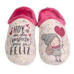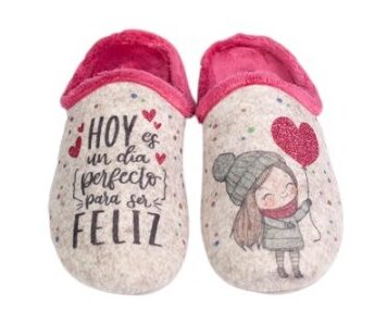 Zapatillas de mujer de estar por casa para Invierno, calentita y muy cómoda, fabricadas en suave tejido. Original frase «Hoy es un dia perfecto para ser feliz».