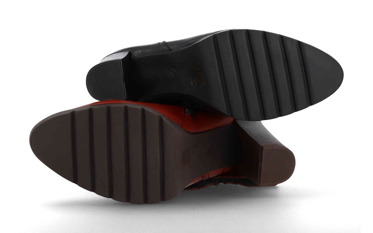 Botines de piel con tacón alto que combinan durabilidad y estilo urbano. Su suela antideslizante garantiza estabilidad, ideal para uso diario en diferentes superficies. Diseño cerrado para proteger y mantener el pie cómodo durante todo el día.