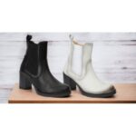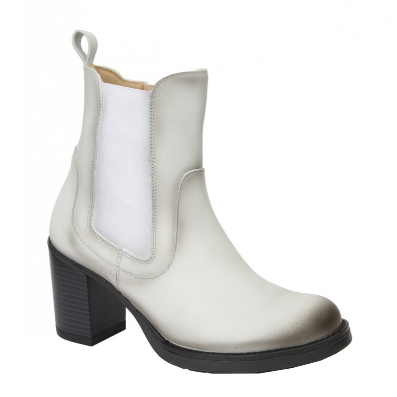 Botín para mujer en piel blanco, ajustable con cremallera y elásticos en ambos lados. Forro textil y plantilla de piel.