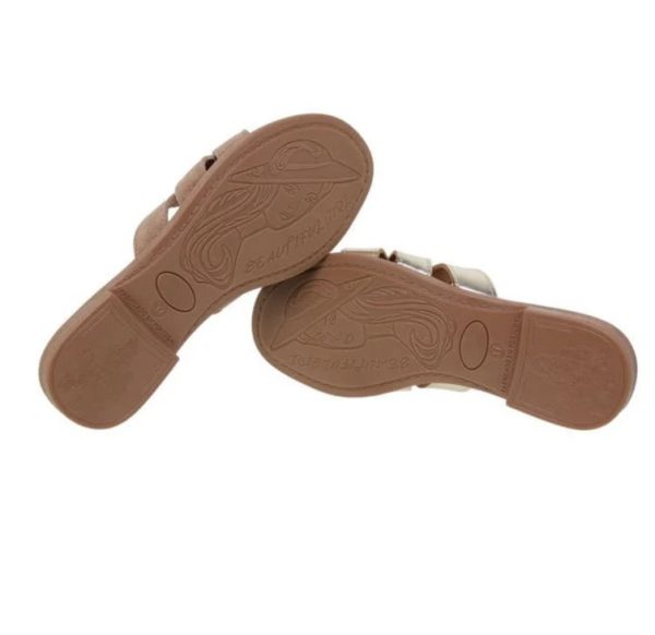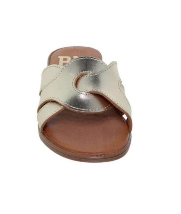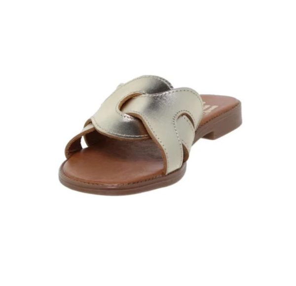 Sandalias mujer planas cómodas piel oro, unas sandalias tupo zuecos, con plantilla de gel y piel suavidad en cada pisada, adorno en la pala muy original, marca Blusandal, hechas en Elche, España.