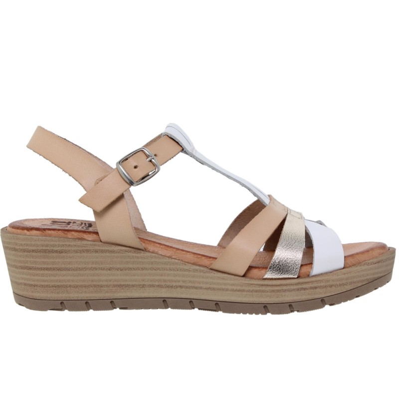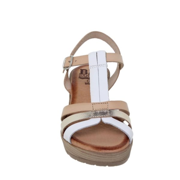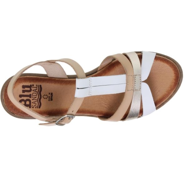 Sandalia 3114BLU: combina elegancia y comodidad con su diseño de tiras en tonos beige, blanco y dorado. Su cuña ligera y plantilla acolchonada garantizan estilo y confort todo el día. Perfecta para cualquier ocasión casual o formal.