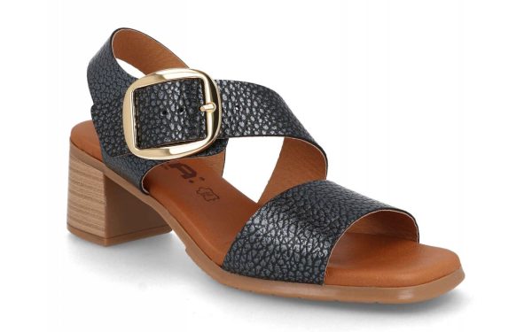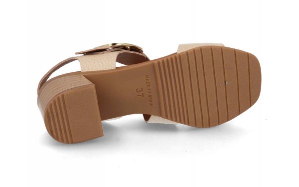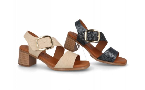 Sandalias elegantes y cómodas con tacón medio cuadrado, diseñadas en piel texturizada disponible en beige y negro. Su suela antideslizante y hebilla metálica dorada garantizan estilo y seguridad para cualquier ocasión. Perfectas para lucir sofisticada con total confort.