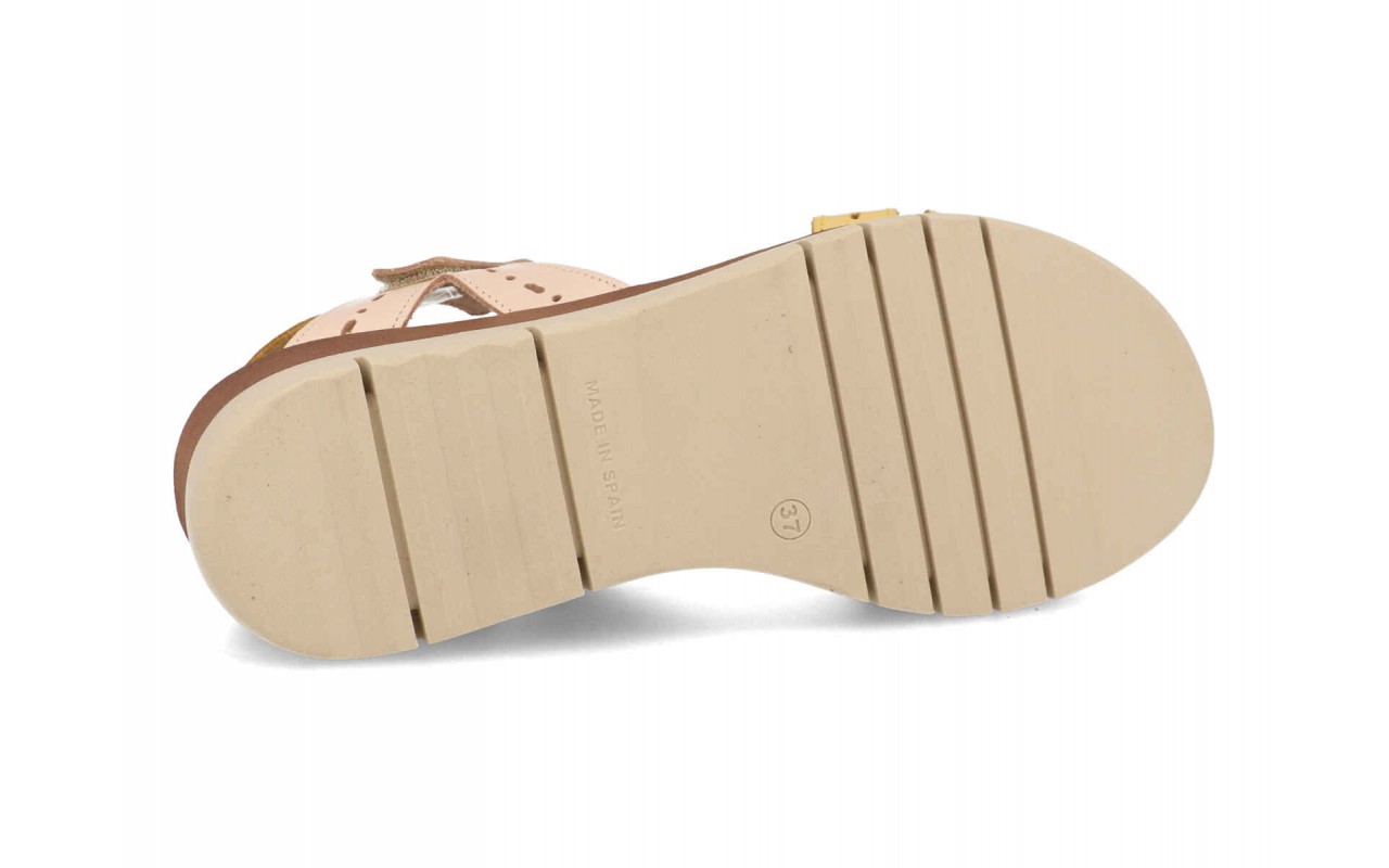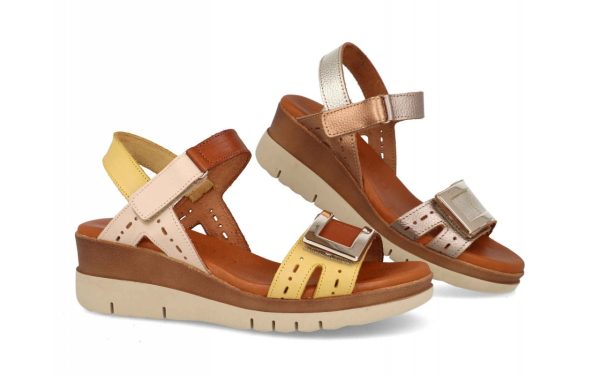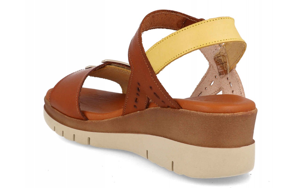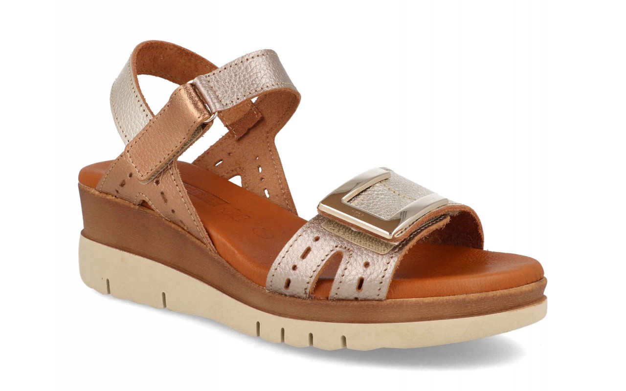 Sandalias mujer cuña, una sandalia con pala de piel, su planta también es de piel y de gel y lo lleva incorporado para proporcionar el confort en cada pisada, Llevan una plataforma de 5cm de altura, ideal para estilizar las piernas sin una altura excesiva, Esta sandalia lleva dos velcros para un cierre mas fácil y mas cómodo. Tallas:35/41, Hecho en España.