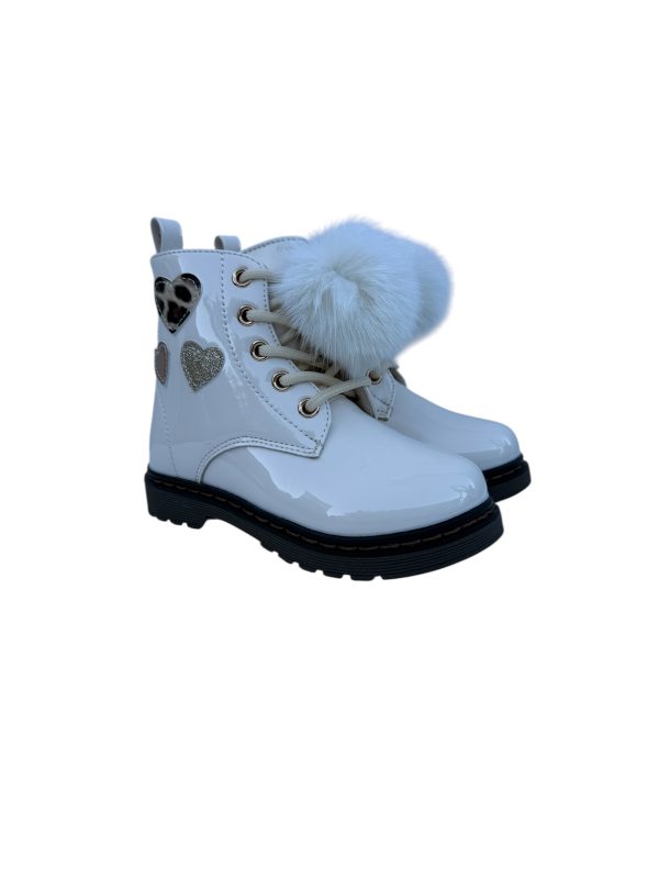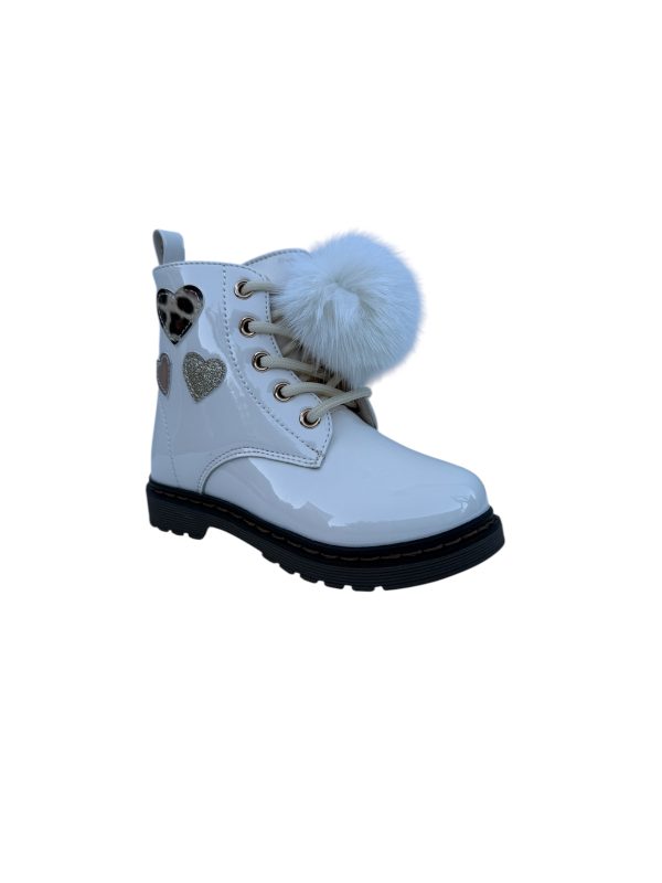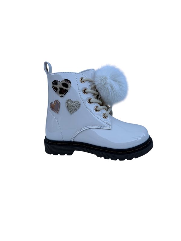 Botines infantiles blancos en charol con detalles de corazones y pompón de peluche, combinan estilo y comodidad para los días de juego y paseo. Resistentes y modernos, ideales para niñas con personalidad.