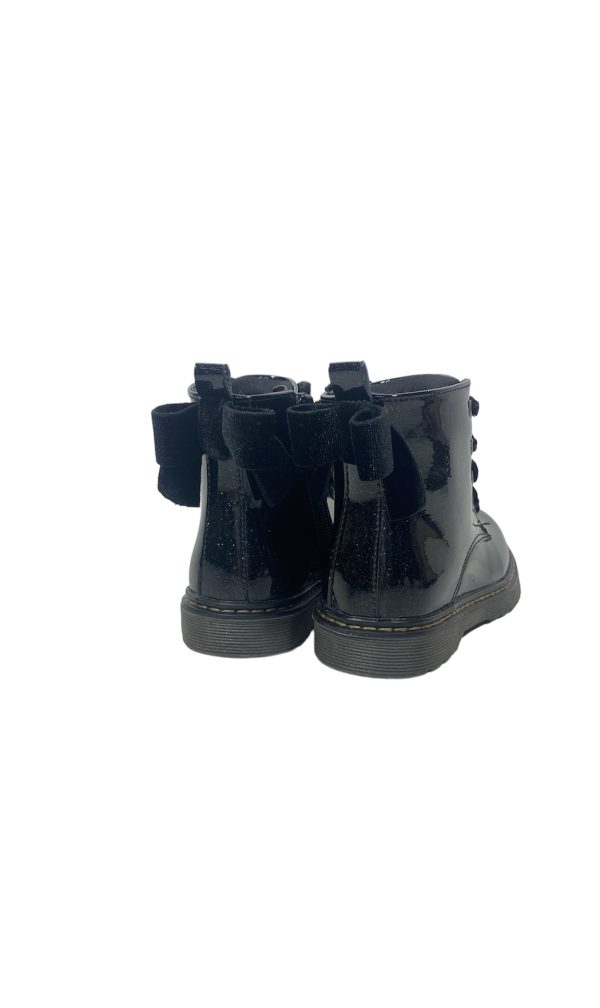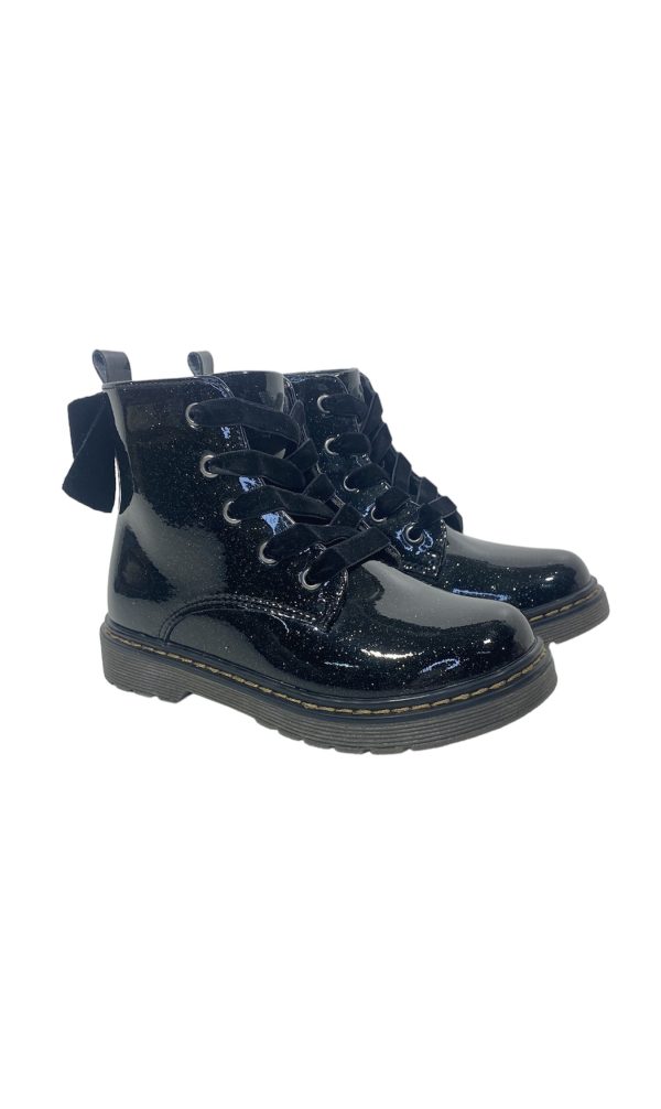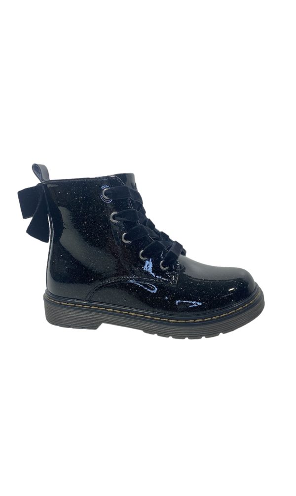 Botín de niña de la marca Xti kids. Fabricado en charol con acabado glitter. Coqueto lazo de terciopelo a juego con los cordones. Cierre mediante cremallera interior para facilitar la puesta. Cómoda suela de goma antideslizante.