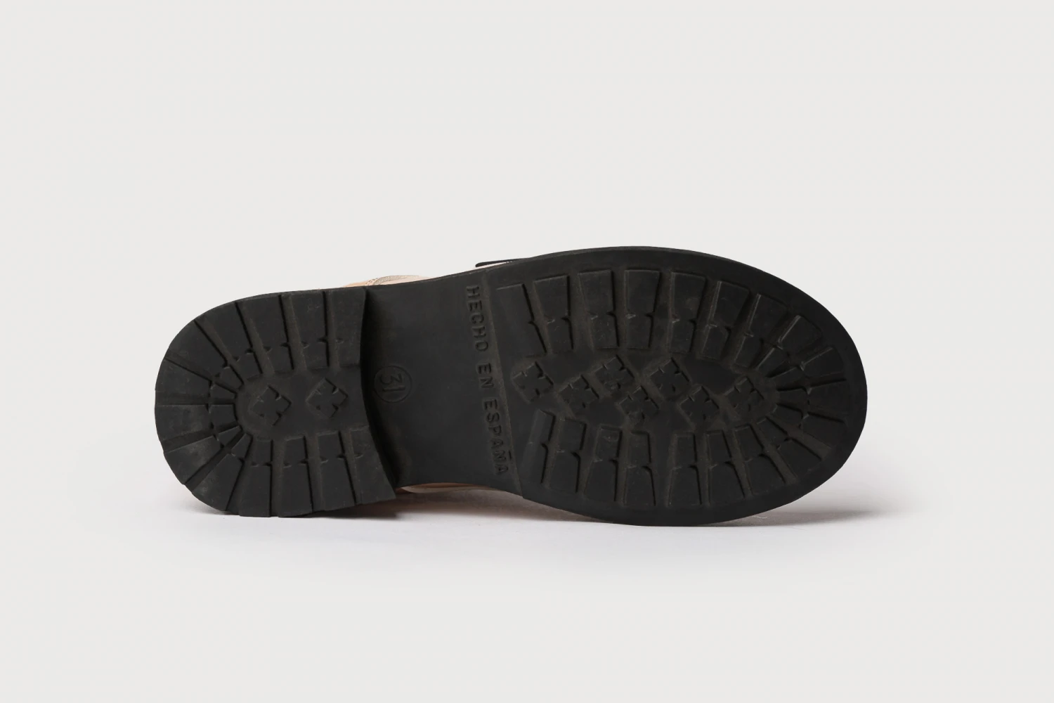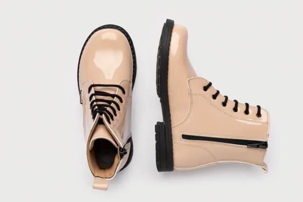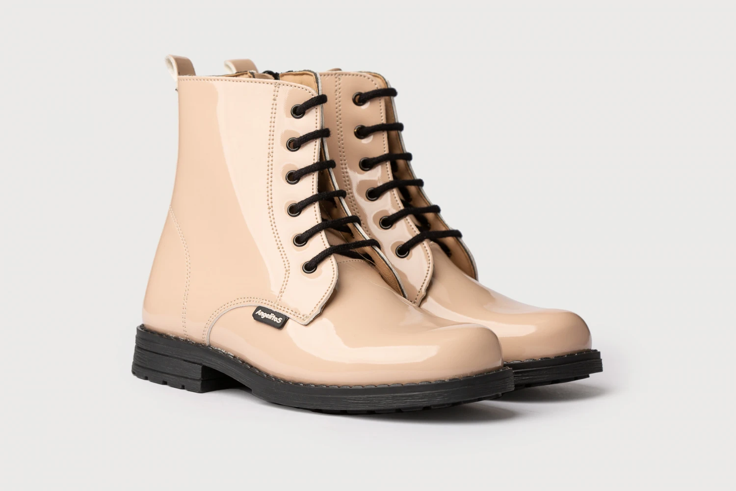 Una línea moderna. Cómodas y blanditas, zapato tipo bota militar fabricada en MICROFIBER charol con sistema de cierre de cordón y cremallera interior. La planta y la parte interior está fabricada con forro textil AngelitoS, protector de punteras y talones, suela de goma antideslizante. Calzado diseñado y fabricado en España.