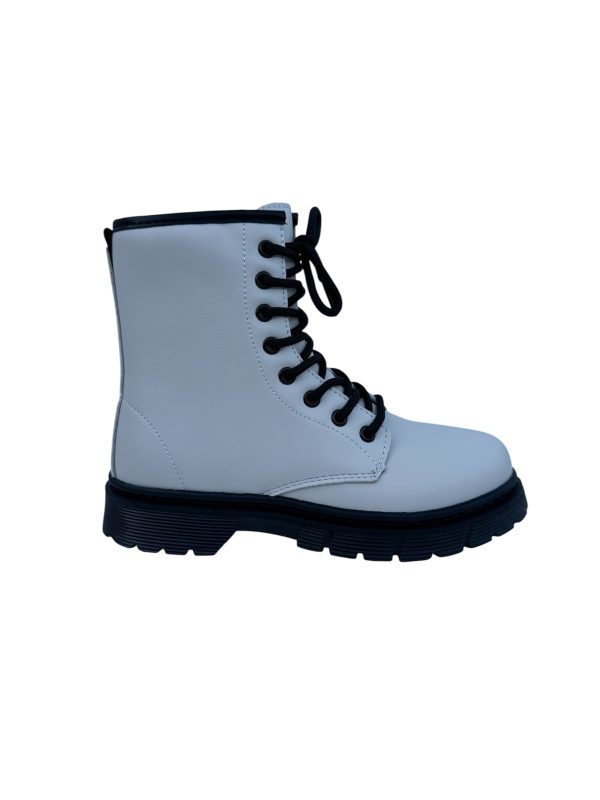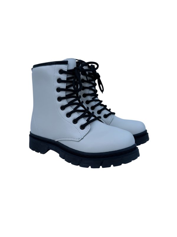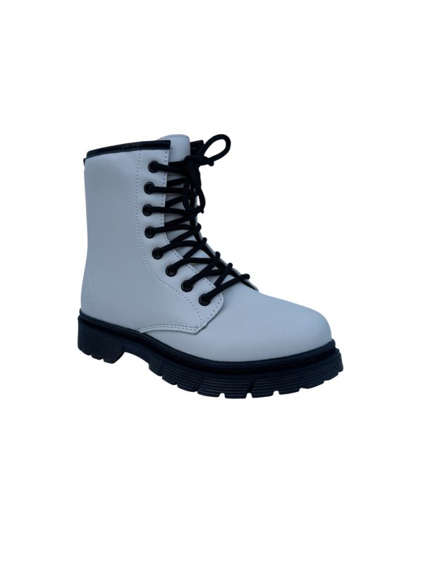 Botín tipo militar en color beige con cordones negros. Añade un toque urbano y versátil a tus looks con estos botines militares. Confeccionado en acabado mate color beige, cuenta con cordones negros en contraste y suela gruesa antideslizante color negro que aporta comodidad y estilo. Su diseño resistente y moderno los convierte en un calzado ideal tanto para el día a día como para elevar tus outfits mas casuales.