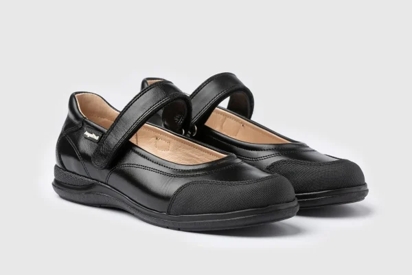 Una línea moderna. Cómodos y flexibles, ideales para los uniformes de cole. Zapato tipo bailarina colegial con puntera de PVC reforzado fabricado en napa de piel bovina con sistema de cierre velcro Go & Back. La parte interior está fabricada con forro de piel natural, protector de punteras y talones, planta con puente anatómico y suela de goma antideslizante. Calzado diseñado y fabricado en España.