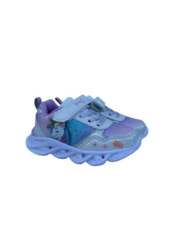 Deportivo infantil unicornio con luces. Divertidas y coloridas zapatillas con diseño de unicornio y acabado en tonos morados, azul y plateado con glitter. incorpora luces en la suela que se encienden al caminar, cierre de velcro y cordones elásticos para un ajuste cómodo y practico. Ideales para acompañar a los peques en todas sus aventuras con estilo y diversion .