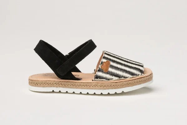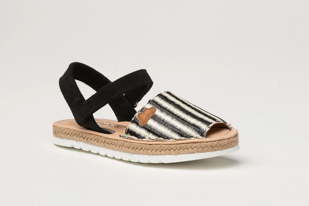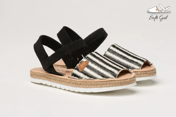 Unas menorquinas ligeras, suaves y flexibles. Zapato tipo menorquina fabricado en ante afelpado de piel bovina y tejido palmira 100 % algodón con sistema de cierre de velcro Go & Back. La parte interior está fabricada con forro de piel natural, planta forrada de piel con gel-látex y memory foam. Suela de EVA de alta calidad antideslizante con yute natural. Calzado diseñado y fabricado en España.