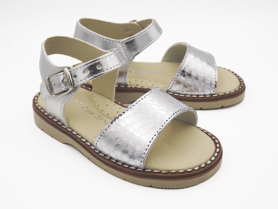 Sandalias infantiles en tono plateado con diseño cómodo y seguro. Perfectas para el día a día, ofrecen ajuste con hebilla y suela antideslizante para mayor estabilidad. Calidad y estilo para acompañar cada paso de los más pequeños.