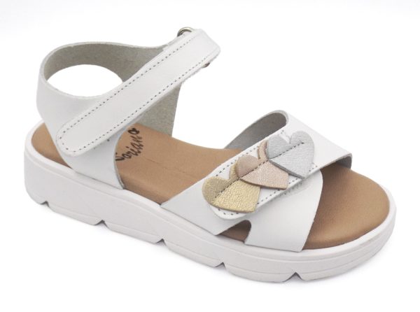 Sandalia blanca para niña, diseño cómodo y ajustable con velcro. Suela ligera y antiderrapante, decorada con elegantes corazones metálicos. Perfecta para uso diario, combina estilo y confort en un calzado infantil de calidad.