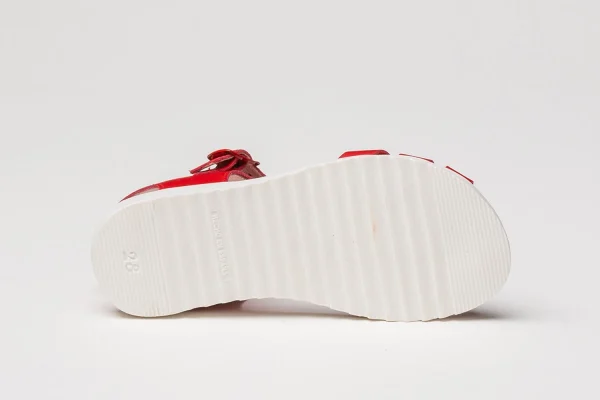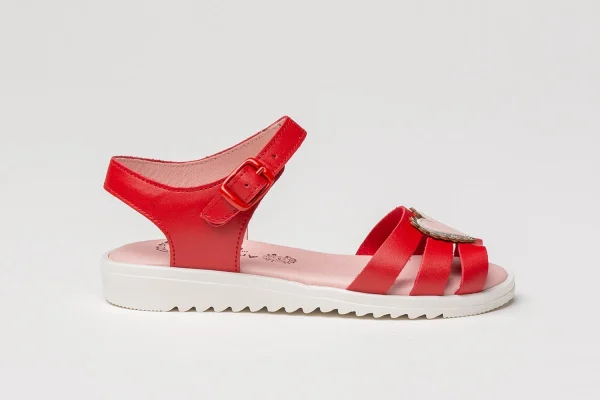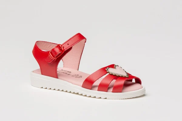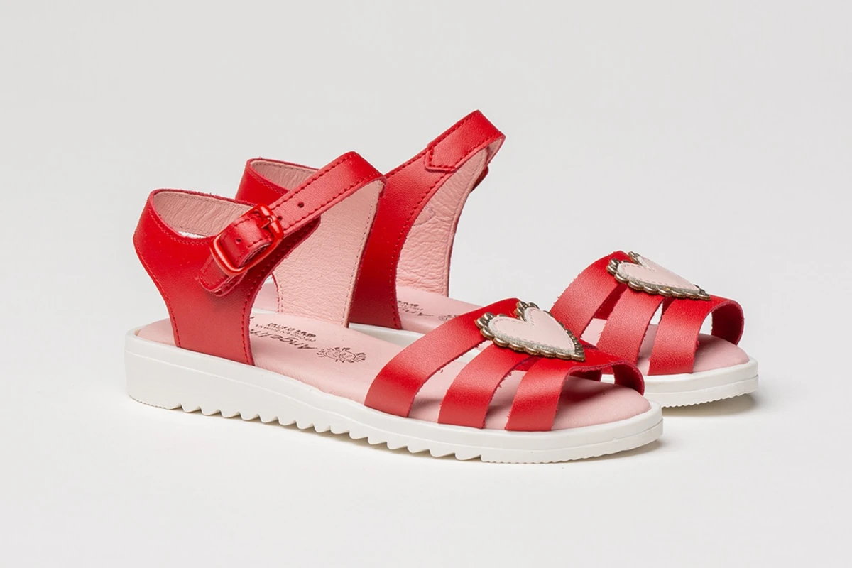 Zapato tipo sandalia fabricado en napa de piel bovina con adorno de corazones en la pala y sistema de cierre de hebilla. La parte interior está fabricada con forro de piel natural, planta con puente anatómico y suela de goma antideslizante. Calzado diseñado y fabricado en España.