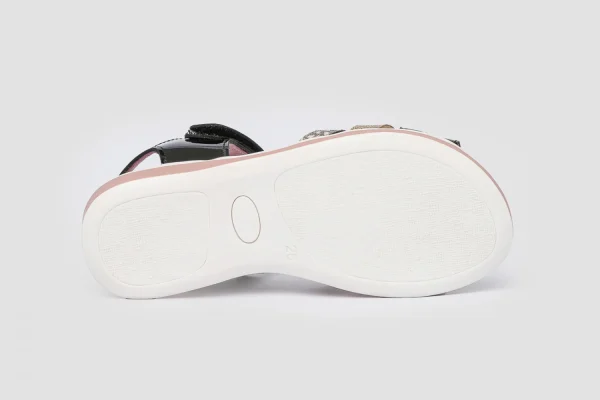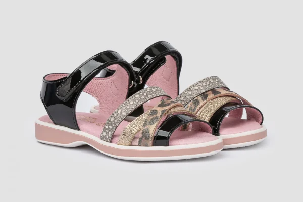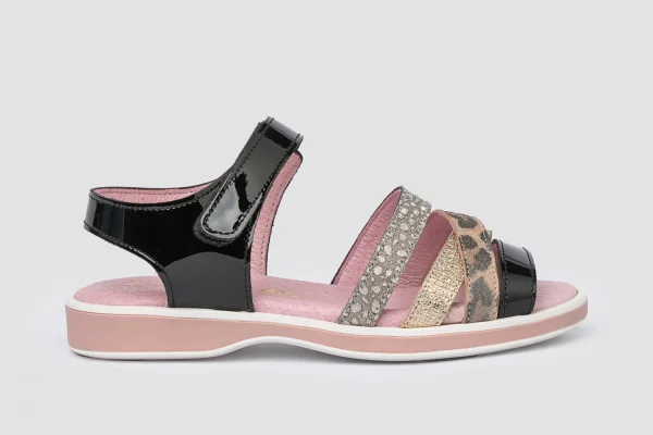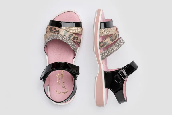 Sandalias ANG-576 para niña, que combinan estilo y comodidad. Diseño moderno con tiras en animal print, texturas metálicas y acabado charol negro, plantilla acolchada en rosa para mayor confort. Suela ligera y antideslizante, perfectas para el día a día con un toque único y divertido. Ajuste seguro con velcro para facilitar el calce. Ideal para que los pasos de los más pequeños sean siempre cómodos y con mucho estilo.
