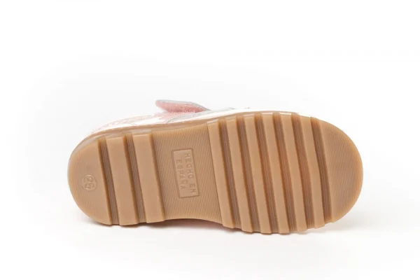 Este calzado infantil ofrece una sujeción firme y ajuste cómodo gracias a su cierre de velcro. La suela antideslizante garantiza seguridad en cada paso, ideal para el uso diario. Fabricado artesanalmente en España con materiales duraderos para acompañar el crecimiento del niño.