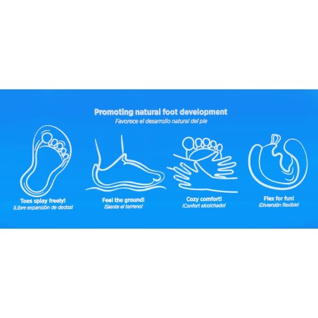 Zapatillas barefoot para niño y niña, diseñadas para fútbol sala. Cuentan con una horma anatómica que respeta la forma natural del pie, ofreciendo mayor estabilidad, comodidad y control del balón en cada jugada.